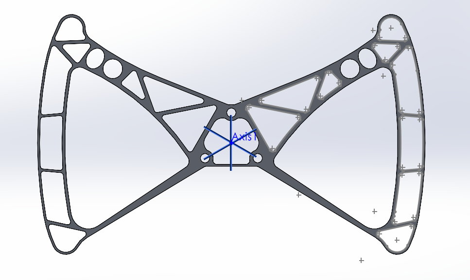 The simulation results revealed that both the central hub region and the upper web carried significantly lower stress compared to the surrounding geometry. This indicated an opportunity to safely reduce mass without compromising stiffness or load-carrying capability. Consequently, our remodeling strategy targeted these low-stress zones, shaving off excess material to create a lighter yet equally robust steering frame.