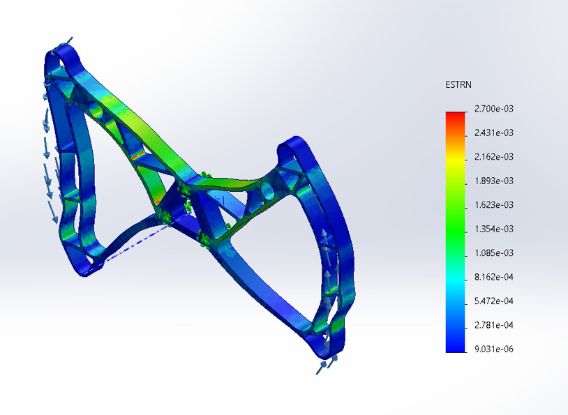The strain plot indicates that the highest strains develop near geometric transitions—such as fillets, pockets, and the spoke–rim interfaces—while most of the rim and webbing remain in lower strain bands. Peak strain values are on the order of 2.7×10⁻³, which is consistent with elastic behaviour for the selected aluminum alloy and comfortably below levels associated with low-cycle fatigue or permanent deformation. This confirms that, under the 600 N loading scenario, the steering wheel deforms in a controlled, elastic manner, and that the pocketing and cutouts in the 2024 design do not introduce excessive strain concentrations that would threaten long-term durability.